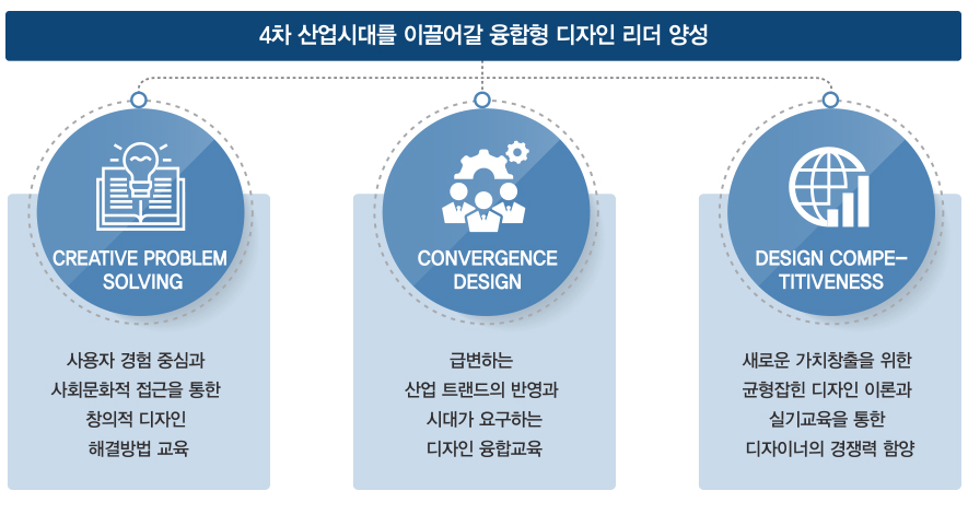 4차 산업시대를 이끌어갈 융합형 디자인 리더 양성 - CREATIVE PROBLEM SOLVING(사용자 경험 중심과 사회문화적 접근을 통한 창의적 디자인 해결방법 교육), CONVERGENCE DESIGN(급변하는 산업 트랜드의 반영과 시대가 요구하는 디자인 융합교육), DESIGN COMPE-TITIVEENESS(새로운 가치창출을 위한 균형잡힌 디자인 이론과 실기교육을 통한 디자이너의 경쟁력 함양)