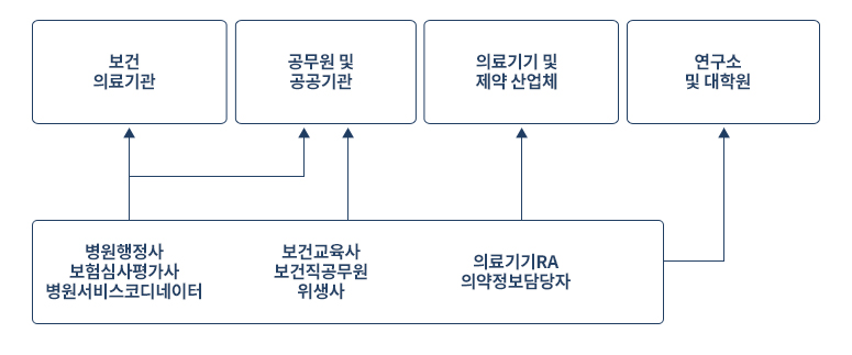 병원의 경우 기획, 원무, 인사, 재무, 구매업무와 의료보험청구, 산업재해 및 자동차 보험 청구업무 등을 담당하는 전문 인력으로 진출할 수 있습니다.