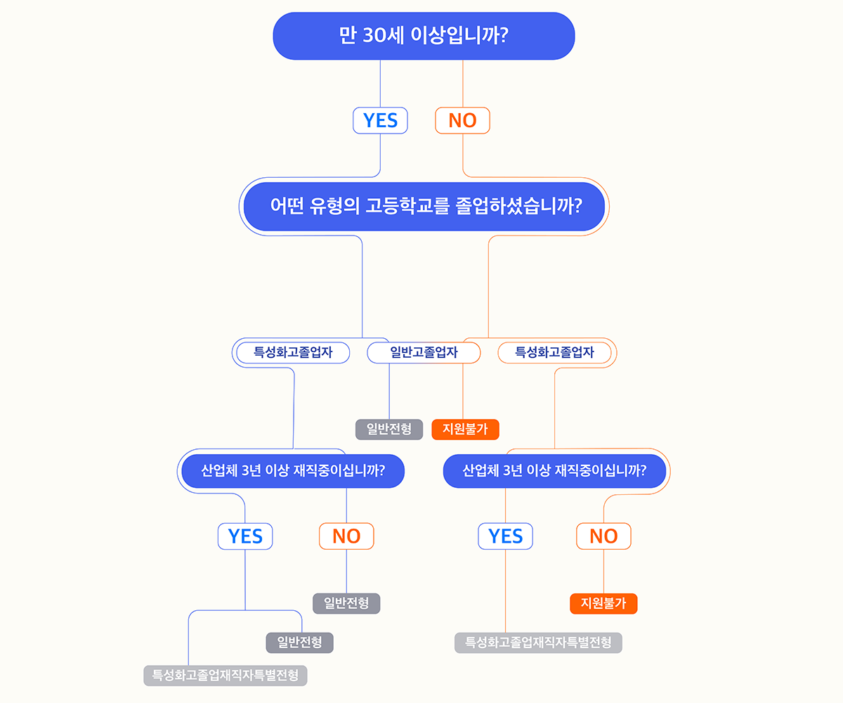 일반 전형 검정고시 및 고등학교 졸업자로서 만 30세 이상 성인 (당해년도 3월 1일 기준) 정원 내