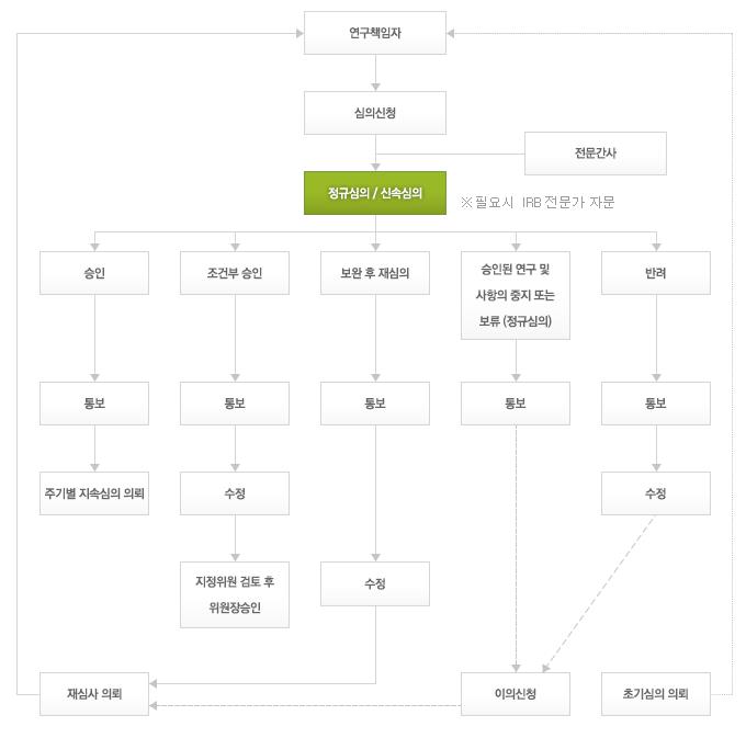 심의흐름도 이미지입니다. 연구책임자 → 심의신청 → 정규심의/신속심의 → 보완 후 재심의 → 통보 → 수정 → 재심사 의뢰 → 연구책임자, 조건부 승인 → 통보 → 수정 → 지정위원 검토 후 위원장승인, 승인 → 통보 → 주기별 지속심의 의뢰, 승인된 연구 및 사항의 중지 또는 보류(정규심의) → 통보 → 이의신청, 반려 → 통보 → 수정, 전문간사, 초기심의 의뢰로 이루어져 있습니다.