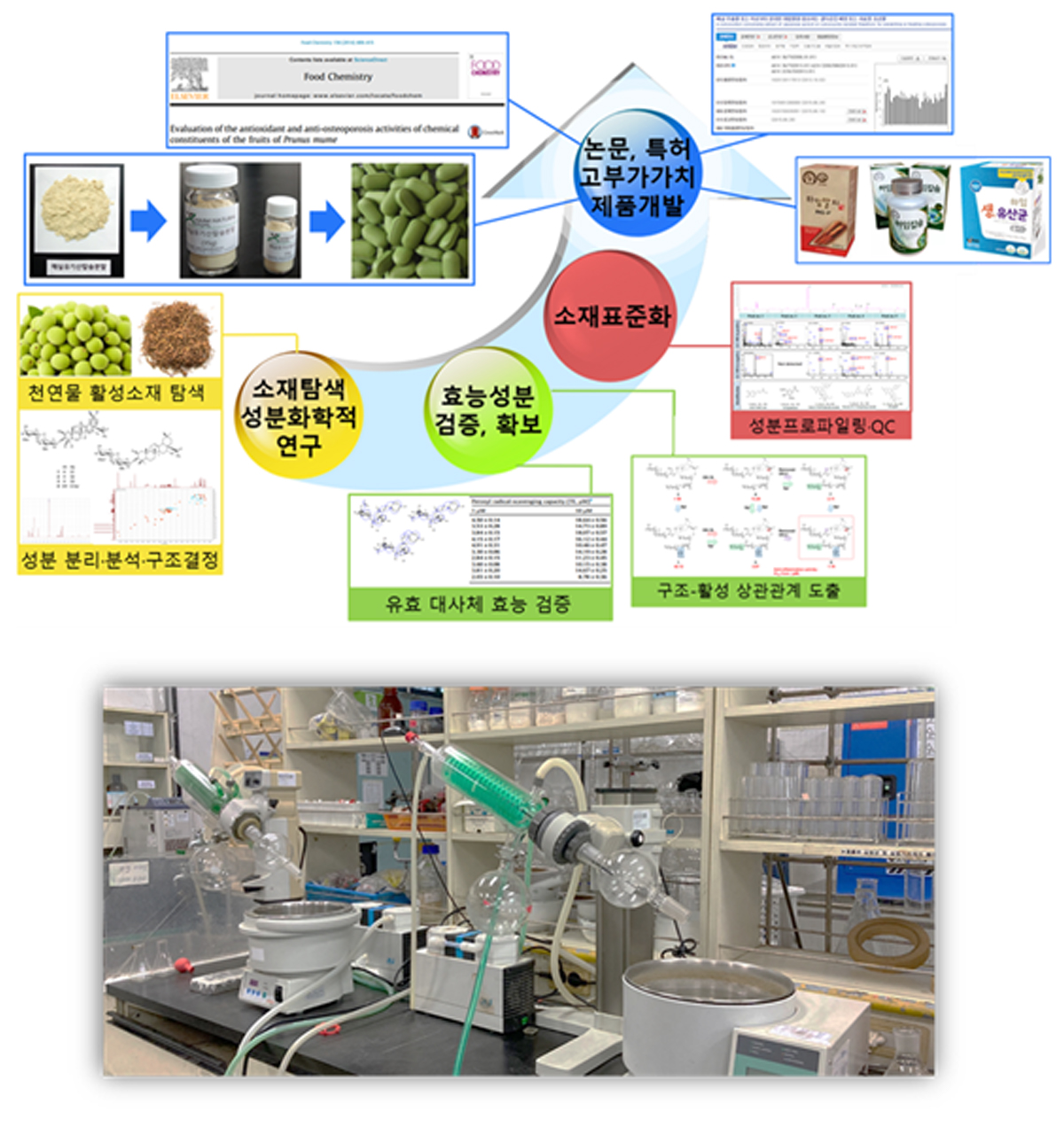 천연물화학 실험실에서는 천연물로부터 유효성분 분리정제 및 구조규명, 천연물유래 신규 이차대사산물 탐색, 소재 표준화, 천연물의 약리학적 효능 규명을 통하여 기능성 천연물 소재를 발굴하는 일을 하고 있습니다.