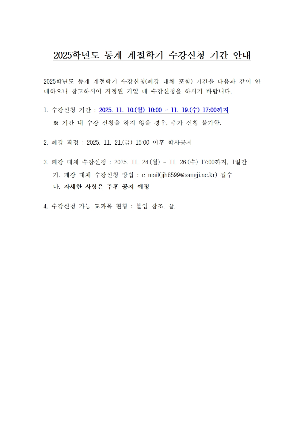 (20251106 기준 수업 개설 현황) 2025학년도 동계 계절학기 수강신청 안내
